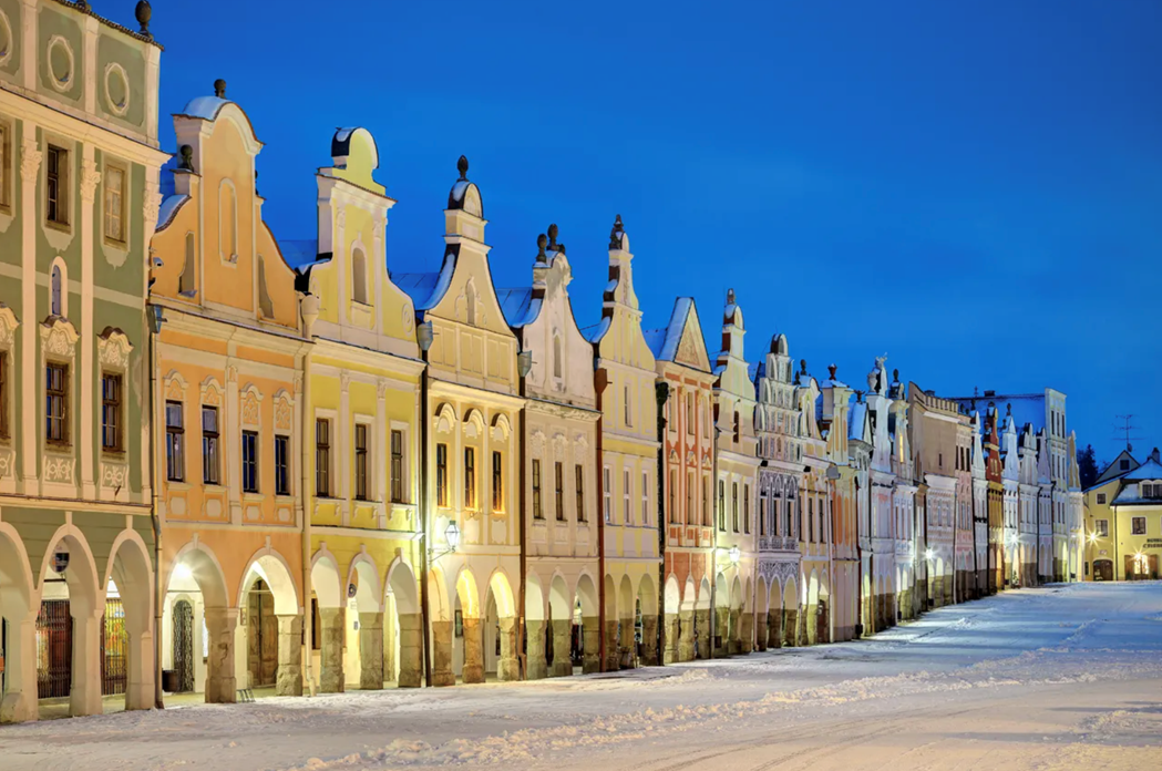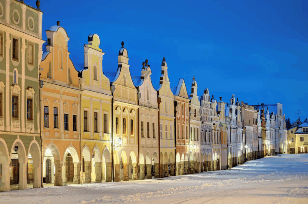 Explore a cidade mágica de Telc, declarada Patrimônio da UNESCO. Passeie pela praça, aproveite o mercado natalino e experimente o trdelník e o vinho quente. Em seguida, visite a vizinha Třebíč para um passeio tranquilo pelo bairro judeu histórico.