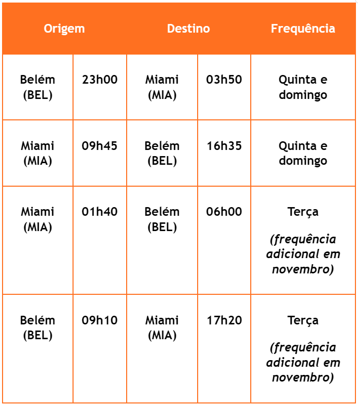 Belém-Miami é uma rota internacional exclusiva da GOL. São dois voos semanais diretos entre as cidades, às quintas e aos domingos, tanto a ida quanto a volta. Durante o período da COP30, em novembro, a GOL ampliará para três as frequências semanais sem escalas entre os dois destinos, a fim de atender a demanda acentuada pelo grande encontro global sobre as mudanças climáticas.