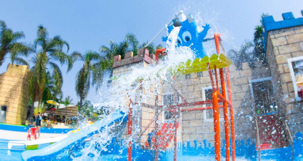 Um mini parque aquático com quatro toboáguas, piscina rasa, jatos d’água, escorregadores e um balde de 1.500 L em formato de mascote, ideal para crianças;