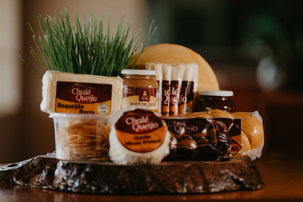 Outros destaques incluem o Queijo Canastra (curado e intenso, com notas terrosas), Queijo Mineiro Fresco e Meia Cura (suave e acessível para o dia a dia), Parmesão e Provolone Desidratado (ideais para queijos ralados), além de doces artesanais variados, quitutes como pão de queijo, cachaças, pimentas e farinhas. Todos são embalados com opções de souvenirs, tornando o Chalé um paraíso para quem busca levar um pedaço de Minas para casa.