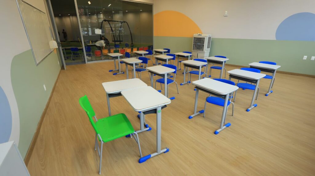 O colégio oferece ensino bilíngue, robótica, educação socioemocional com o Programa Bene, atividades esportivas e infraestrutura moderna, incluindo laboratórios, biblioteca, salas maker, espaços de recreação e segurança com reconhecimento facial.