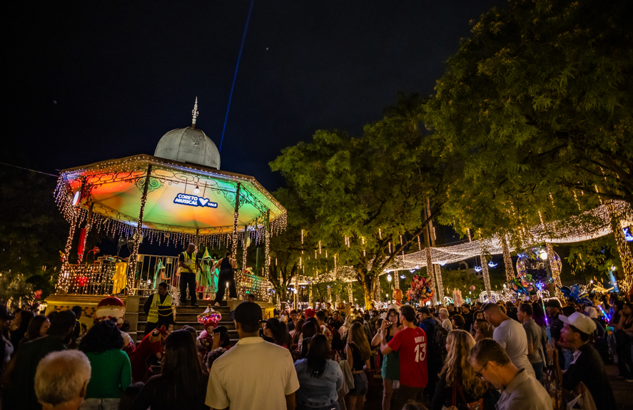 O domingo, 7 de dezembro, tem a Corporação Musical Nossa Senhora de Lourdes (18h), o Coral Acordos e Acordes (18h40), o Candy Dance (19h20) e o grande show de Affonsinho + Tadeu Franco (20h).