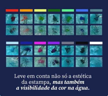 - Evite cores como azul claro, branco, tons pastéis. Essas tonalidades somem ou dificultam a visão quando a criança está na água, principalmente se a água estiver agitada ou com reflexo do sol.