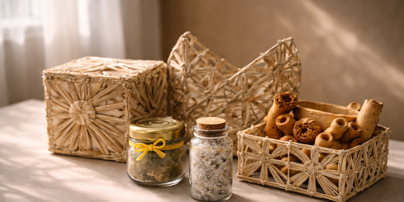 Caixas e cachepôs da associação Mulheres de Fibra são confeccionados à base da renda filé, com fibra natural extraída do tronco da bananeira