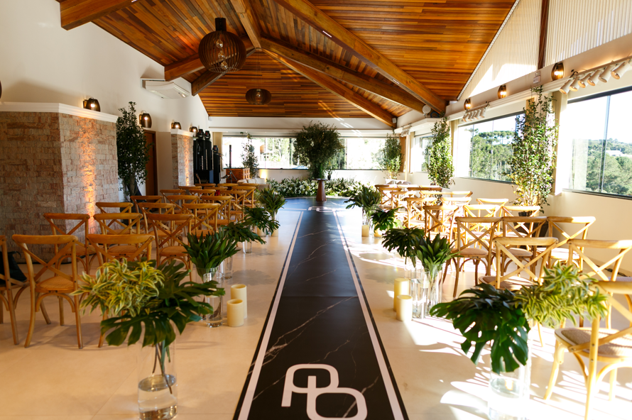O espaço acaba de ganhar um novo deck ao ar livre de frente para o lago, com capacidade para cerca de 100 pessoas, criando um cenário intimista e romântico para cerimônias ao pôr do sol. Outra alternativa é o deck do restaurante, que combina a vista para os vinhedos à estrutura do Gralha Azul. Já o salão climatizado comporta até 130 convidados, garantindo conforto mesmo em dias de clima adverso.