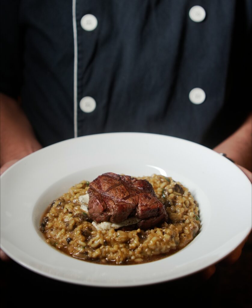 Preparo: Risoto de café c/ funghi tornedor de mignon recheado com queijo Minas flambado na cachaça.