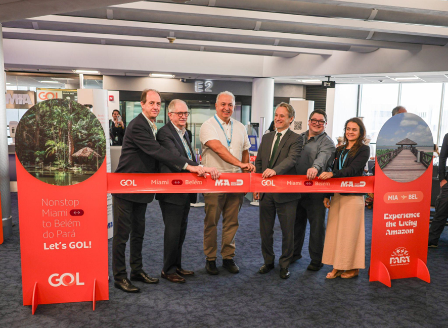 Na manhã desta quinta-feira (26), no Aeroporto Internacional de Miami, aconteceu o tradicional corte de faixa da rota exclusiva MIA-BEL, na presença de representantes da GOL, do estado do Pará e do aeroporto norte-americano. O voo G3 7933 deixou a cidade americana às 9h45, e a aterrissagem em Belém aconteceu às 16h.