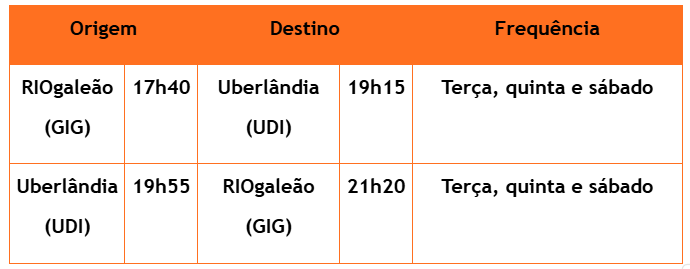 Uberlândia (UDI) – RIOgaleão (GIG): a partir de 05/05/2026