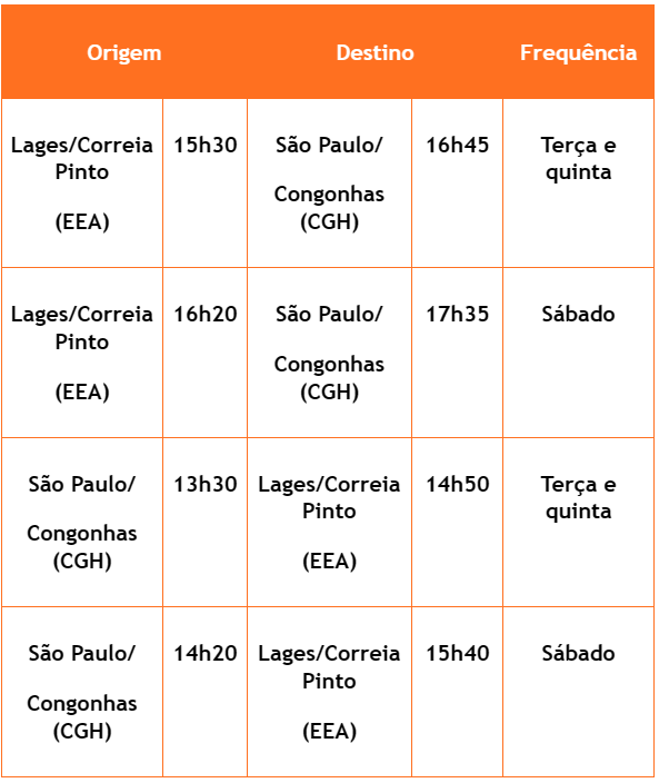 Lages/Correia Pinto (EEA) – São Paulo/Congonhas (CGH): a partir de 27/11/2025