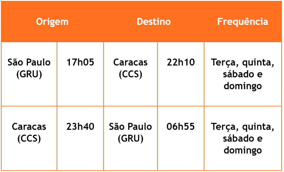 | São Paulo/Guarulhos (GRU) – Caracas (CCS): a partir de 5/08/2025 |
