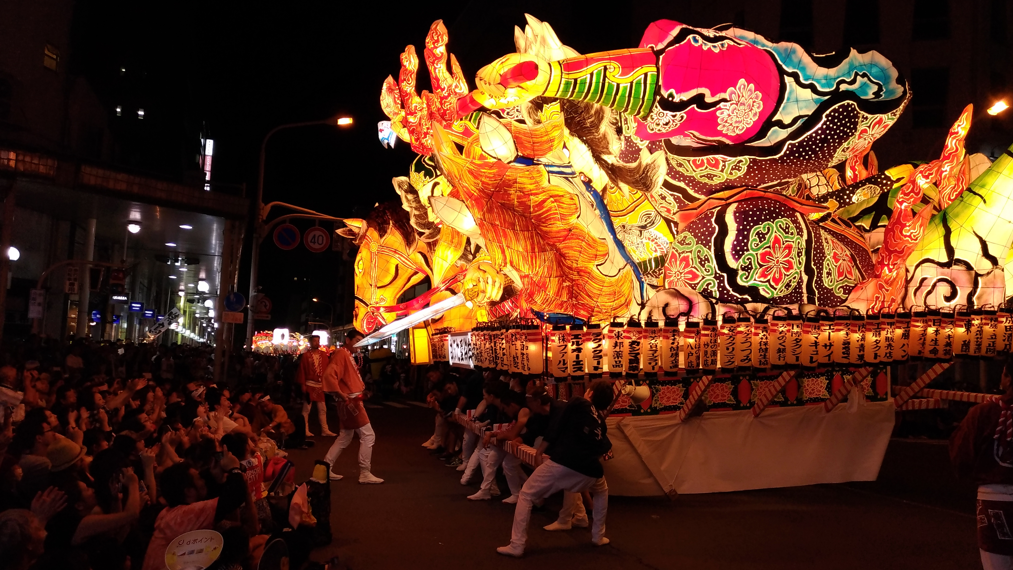 As origens do Festival Nebuta de Aomori não são conhecidas com exatidão, mas podem ser ligadas a uma celebração chinesa associada a pedidos escritos em tiras de papel. Essa tradição teria se unido a costumes regionais japoneses, dando origem ao festival. A principal atração são enormes lanternas iluminadas chamadas nebuta, que retratam figuras humanas inspiradas em guerreiros antigos, personagens históricos ou do kabuki, um teatro japonês marcado por maquiagem exagerada e gestos dramáticos. Esses carros alegóricos desfilam pelas ruas acompanhados por dançarinos que saltam e giram animadamente ao som das bandas compostas por tambores, flautas e pratos. O festival inclui desfiles noturnos, versões infantis e uma procissão marítima com fogos de artifício. (website)