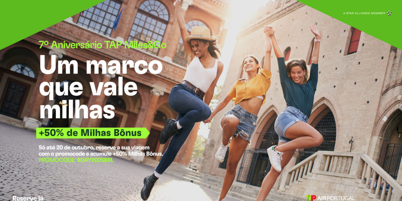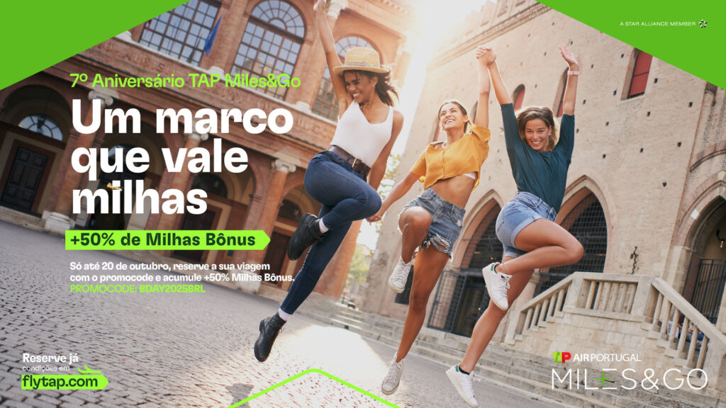 O programa de fidelização da TAP Air Portugal celebra agora o seu sétimo aniversário e está oferecendo mais 50% de Milhas Bônus nas reservas feitas em flytap.com, até 20 de outubro, com o código promocional BDAY2025BRL. O aniversário é nosso, mas a data de milhas é para os membros TAP Miles&Go. Saiba mais aqui.
