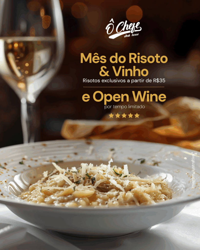 Quem ai não ama um risoto? Outubro é o mês dos risotos em Ô Chefe. Uma seleção incrível com opções a partir de R$ 35 e, pra harmonizar, tem ainda open wine por R$ 69, disponível de terça a quinta. O Festival de Risoto foi desenvolvido pelo Chef Ronaldo Avelar e se destaca pela ampla variedade. O cardápio especial esta disponível de terça sábado somente à noite, nas duas unidades, e por tempo limitado. As trinta opções foram estruturadas por estilo, como os vegetarianos, especiais e os Premium com sabores para todos os gostos.