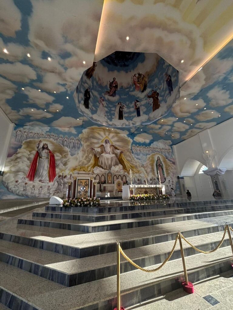 Arquitetonicamente, o santuário mescla traços neogóticos e elementos modernos, com nave central, pinturas sacras feitas à mão e uma escadaria de 99 degraus, concebida como símbolo de penitência e fé.