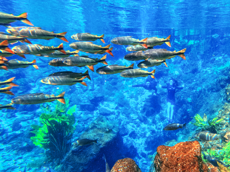 Para completar o cenário de pura beleza natural, há peixes por todos os lados, enquanto o leito do rio é coberto por um colorido jardim subaquático. Equipado com colete salva-vidas, máscara de mergulho e snorkel (o traje de neoprene é opcional), dá para observar tudo com uma riqueza de detalhes, enquanto você flutua ao longo do rio. Por ser realizada em um curso de água mais raso, com apenas uma leve correnteza, a flutuação da Nascente Azul é indicada para pessoas de todas as idades, inclusive para quem não sabe nadar.