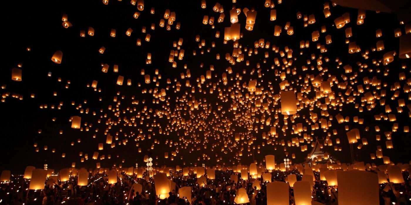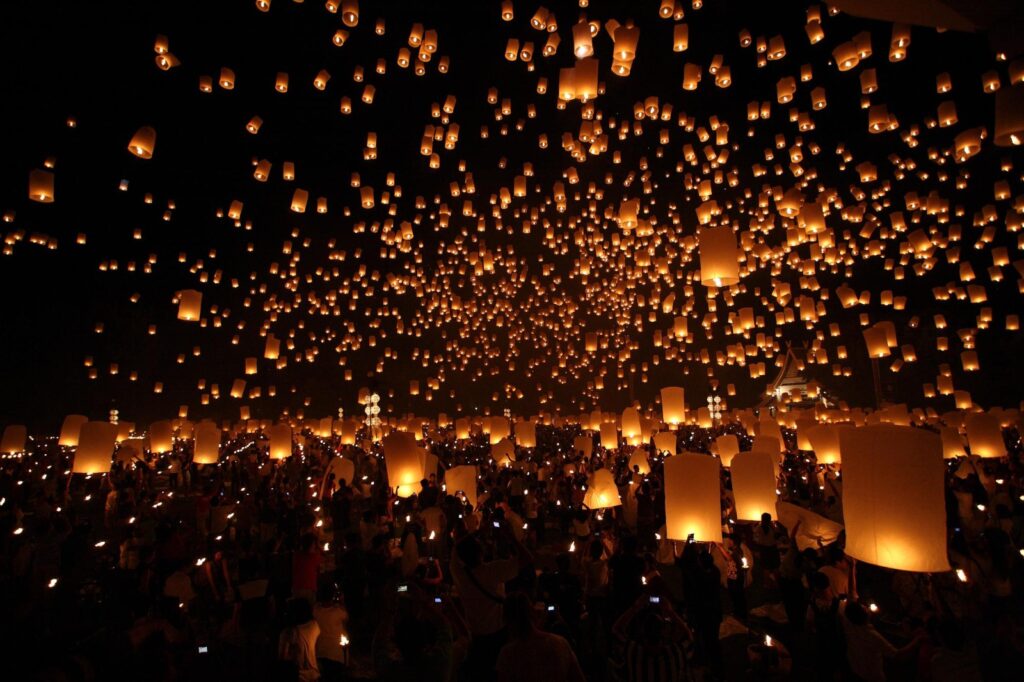 A origem das lanternas está ligada ao antigo povo Lanna, que vivia no norte da Tailândia. Segundo a tradição, os balões de papel eram lançados ao céu durante a lua cheia do 12.º mês lunar como forma de enviar orações às relíquias de Buda guardadas nos céus. Com o tempo, o gesto de devoção se transformou em um espetáculo visual que encanta tailandeses e turistas do mundo todo. Hoje, mesmo com regras mais rígidas para o lançamento das lanternas nas cidades, a celebração continua viva, com casas e templos decorados por pequenas luzes e velas que mantêm acesa a essência espiritual do Festival das Lanternas.