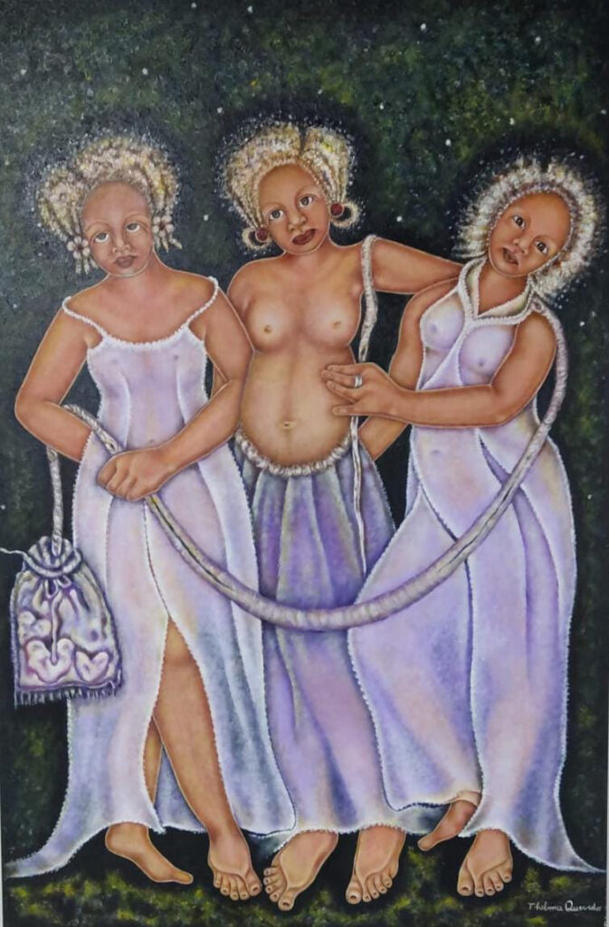 A arte da multiartista Thelma Quevedo (Pintura, Cerâmica e Objetos) é reflexo do orgulho de si e de suas conquistas de fé, luta e amor ao próximo e à próxima. Há feminismo e feminilidade amalgamados corajosamente. Fatores decisivos para a boa apreciação da obra: compreensão histórica e política da mulher na formação da cultura nacional, discernimento em relação ao peso do domínio sobre mulheres e a capacidade, após tudo somado, ainda amar, acolher e abraçar.