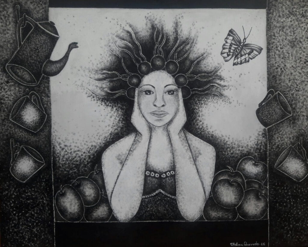 Os objetos de luta e amor através da feminilidade histórica: o bule, as xícaras e os copos. Maçãs e a liberdade da borboleta. Debruçar-se contemplativa à janela cria tempo para planejar boas mudanças. Obra de Thelma Quevedo