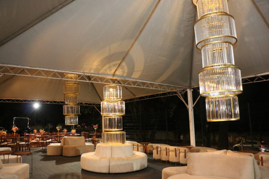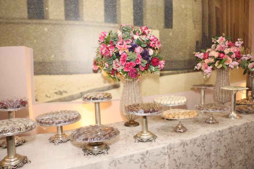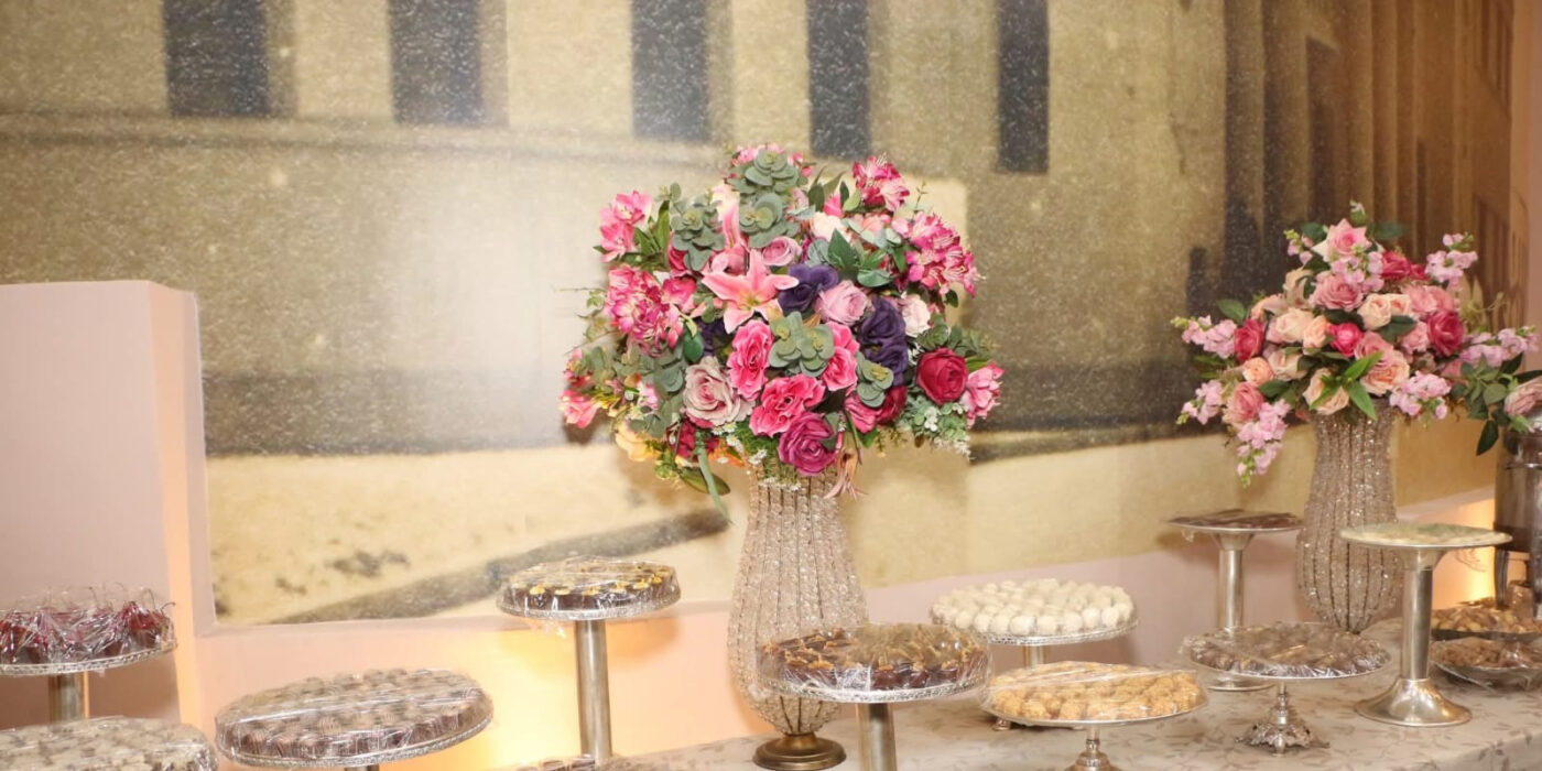 Enchanting detail: the photos upon arrival were taken with a “background” of rain of long and illuminated canutillos, magical, a prelude to the exuberant decoration that followed, of the theater and its stage, and its various adjacent salons, completely prepared decoratively by the talent of the professional electrician, florist, and vitral artist, the young entrepreneur Darlen Lima, in charge of Darlen Lustres. Everything was impeccable, from the reception to the decor from start to finish of the magnificent spectacle.